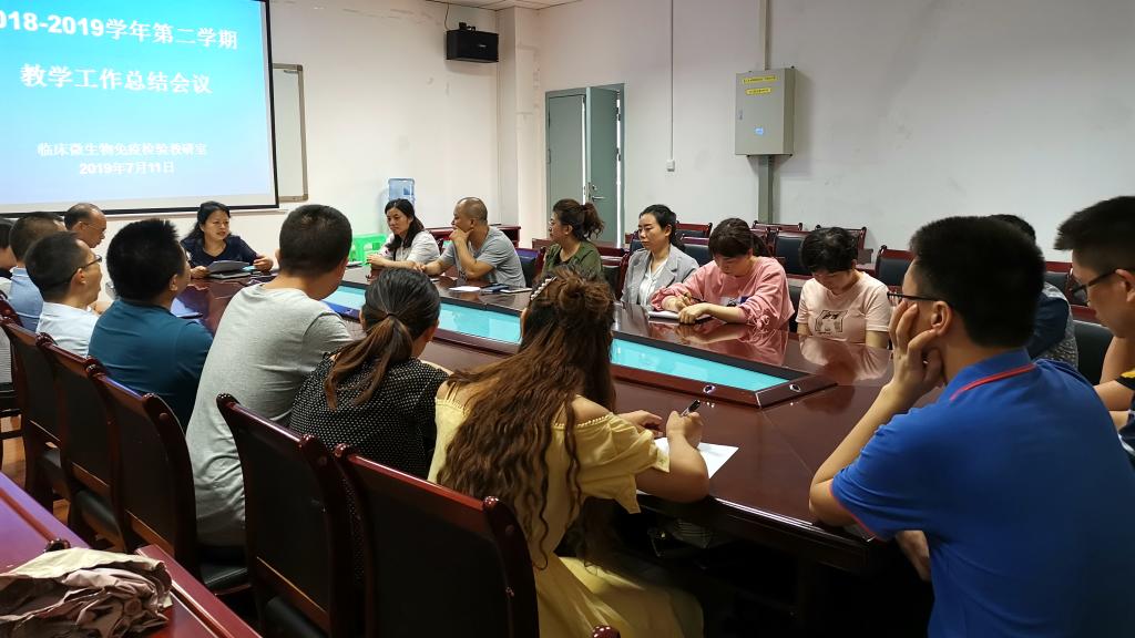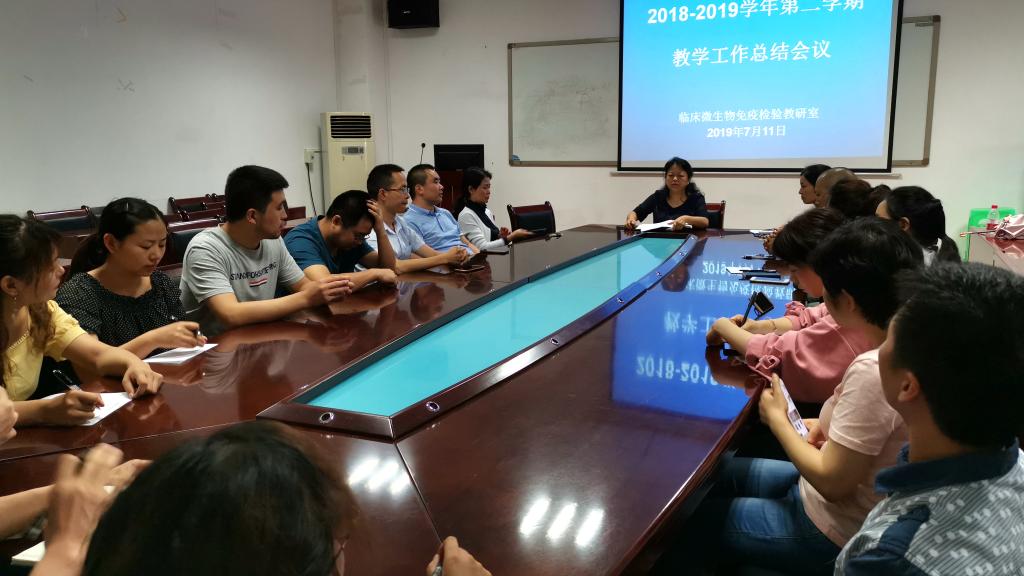 2019年7月11日,在门诊六楼会议室,微生物免疫检验教研室积极开展了2018-2019学年第二学期教学工作总结会及初中后期教学检查反馈会,会议由教研室主任陈泽慧教授主持,课程组长何应中副教授、教学秘书席微以及任课教师黄俊琼博士、黄健副博士、张丽丽博士、刘凤副教授、董泽令、陈安林等近30位老师参加了本次会议。