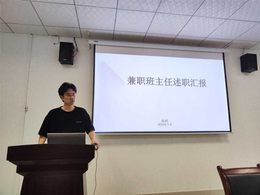 2024年7月4日下午3点,太阳成tyc122cc集团在2-508会议室开展2023.9-2024.7学年教师兼职班主任考核述职汇报。由公司党政领导班子成员、科级干部以及各教研室、员工党支部负责人组成的教师兼职班主任工作领导小组全体成员作为评委,由14名教师兼职班主任以PPT形式进行述职汇报。述职汇报会由党委书记周光润主持,公司员工处思政科科长吴虞娱列席会议并担任评委。