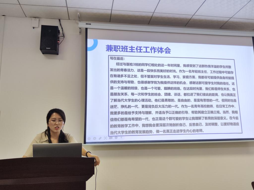 随后,14名教师兼职班主任围绕本人针对班级所做的工作、“强素质、早科研、重临床、分方向”特色培养方案所开展的工作、建设成效、存在问题及改进措施(工作建议)、下一年度工作计划等方面进行述职汇报。
