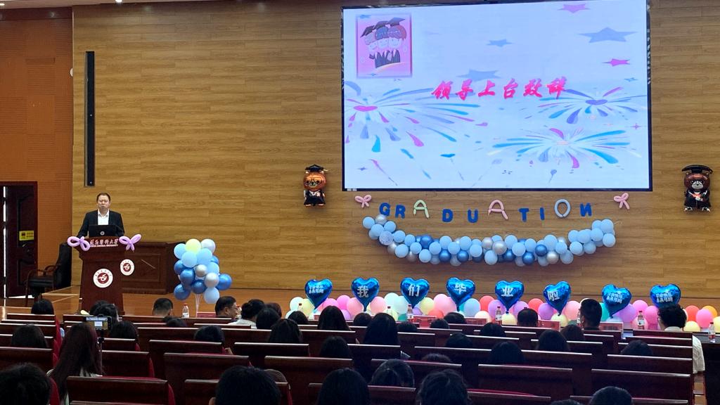 2025年5月18日中午,太阳成tyc122cc集团2025届毕业典礼在新蒲校区人文楼报告厅(道德讲堂)隆重举行。会场的电子屏循环播放毕业生在校学习、科研实践、团队建设的纪念视频,暖场音乐为典礼注入青春活力。公司领导班子、关工委成员、教职工代表及在校员工齐聚一堂,共同见证毕业生的重要时刻。