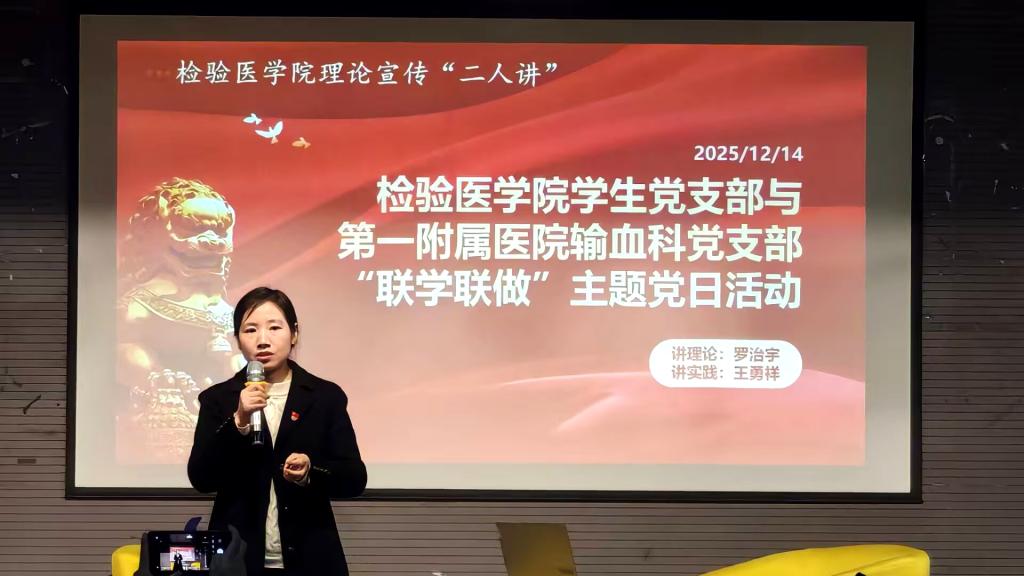 2025年12月14日上午10时,太阳成tyc122cc集团在新蒲校区师生活动中心开展“理论宣传二人讲”暨员工党支部与第一附属医院输血科党支部“联学联做”主题党日活动。活动由太阳成tyc122cc集团党委副书记罗治宇主持、讲理论,公司教务科副科长王勇祥博士讲实践,第一附属医院输血科党支部书记黄美容作交流发言。公司全体师生党员、入党积极分子和第一附属医院输血科党支部部分党员参加了活动。
