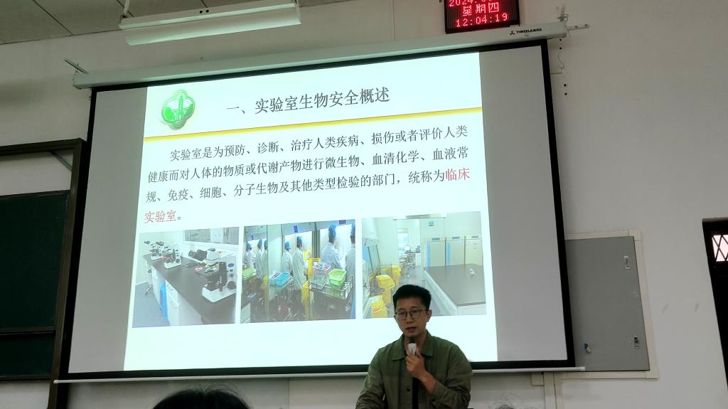 接着,梁钟智老师为同学们进行生物安全培训,详细介绍了实验室常见生物安全风险,包括病原微生物的传播途径、潜在危害以及个人防护等,详细讲解了实验室生物安全规范,包括实验室准入制度、个人防护装备的正确使用、实验操作规范、废弃物处理流程等,并强调了生物安全的重要性,提醒同学们要时刻保持警惕,防患于未然。段晓雷老师详细讲解了毕业论文管理规定和书写要求以及选择科研实习方向的具体安排。针对科研实习岗,主要是培养科研思维、科研能力和独立思考能力,包括参与科研项目、协助导师进行实验操作、进行数据分析和论文撰写等。