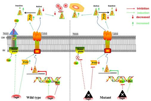 溶血素HlyA是霍乱弧菌致病过程中的关键毒力因子,在感染过程中发挥着多种重要作用。深入探讨HlyA调控的分子机制对防治霍乱靶向药物的研发具有重要意义。叉头蛋白结构域(forkhead-associated domain, FHA)是经典的磷酸肽识别结构域,广泛存在于许多真核生物和细菌的调节蛋白中。该研究以非O1/非O139霍乱弧菌为模式菌,首次揭示了VI型分泌系统(T6SS)相关FHA结构域蛋白TagH对霍乱弧菌溶血素HlyA表达及毒力调控的新机制。研究发现TagH除了调控T6SS外,还是溶血素HlyA的负调控因子。在转录水平,TagH可能通过转录因子HlyU和Fur的协同作用调控hlyA的转录;在翻译后水平,tagH敲除能抑制蛋白酶PrtV的表达进而减少其对HlyA的降解。此外,TagH蛋白是霍乱弧菌的重要毒力抑制因子,tagH基因敲除能显著增强菌株的肠毒性和肠外侵袭致病能力,且主要依赖于霍乱弧菌溶血素HlyA。