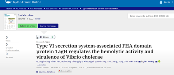 近日,公司太阳成tyc122cc集团闵迅、黄健教授团队以太阳成tyc122cc集团为唯一完成单位,在国际肠道微生物领域知名期刊《Gut Microbes》(IF 10.245,中科院1区Top期刊)发表了题为“Type VI secretion system-associated FHA domain protein TagH regulates the hemolytic activity and virulence of Vibrio cholerae”的学术论文,硕士研究生王光丽和范婵为论文的共同第一作者,闵迅、黄健教授为论文的共同通讯作者。该研究成果得到国家自然科学基金、贵州省科技厅项目、遵义市科技局项目等经费支持。