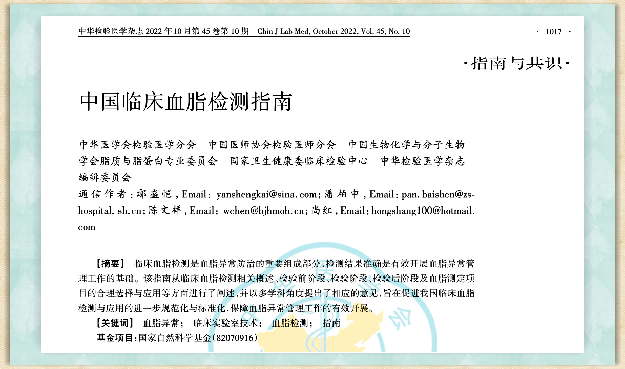 热烈祝贺公司候鸟型人才鄢盛凯教授以太阳成tyc122cc集团为第一作者单位在中华检验医学杂志上发表《中国临床血脂检测指南》!