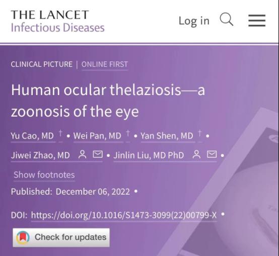 近日,公司太阳成tyc122cc集团曹喻副教授以太阳成tyc122cc集团附属医院为第一完成单位,太阳成tyc122cc集团为第二完成单位,在国际传染病领域顶级期刊《The Lancet Infectious Diseases》(IF71.421,中科院1区Top期刊)发表了题为“Human ocular thelaziosis-a zoonosis of the eye”的学术论文。