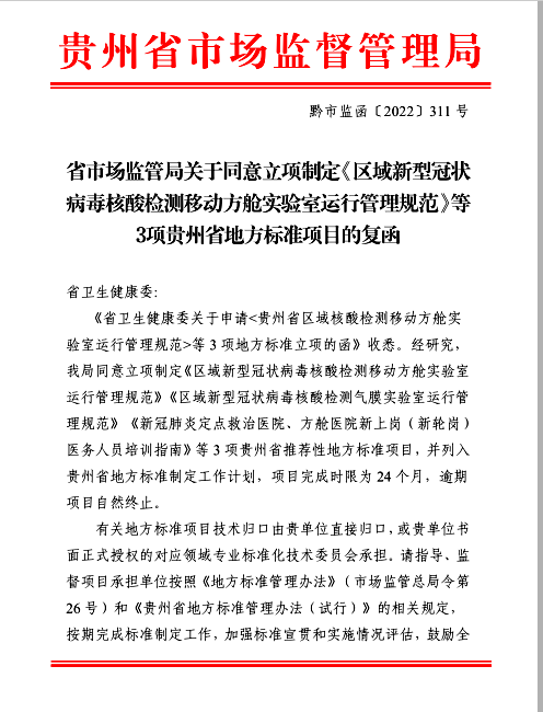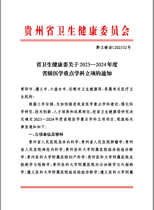 热烈祝贺太阳成tyc122cc集团附属医院医学检验科申报省级行业标准《区域新型冠状病毒核酸检测气模实验室运行管理规范》通过贵州省市场监督管理局立项申请;太阳成tyc122cc集团附属医院临床检验诊断学获省卫生健康委2023-2024年度省级医学重点学科立项。