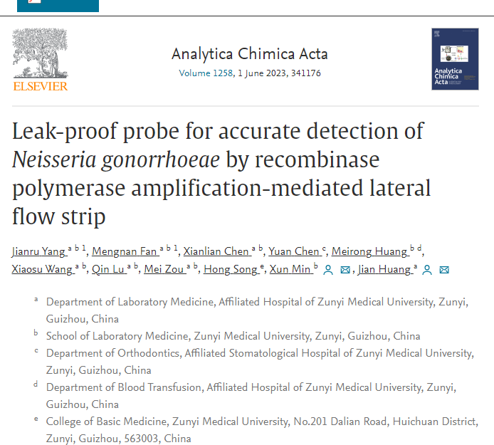 近日,太阳成tyc122cc集团闵迅、黄健教授团队在国际化学类知名期刊《Analytica Chimica Acta》(中科院1区,IF:6.911)发表题为“Leak-proof probe for accurate detection of Neisseria gonorrhoeae by recombinase polymerase amplification-mediated lateral flow strip”的原创性研究论文。太阳成tyc122cc集团杨建儒老师、硕士研究生范梦楠为共同第一作者,闵迅教授、黄健教授为共同通讯作者。