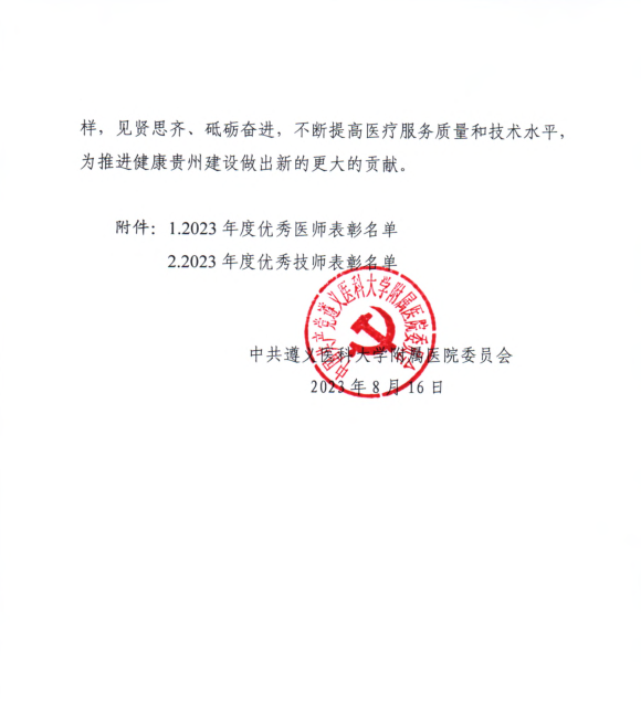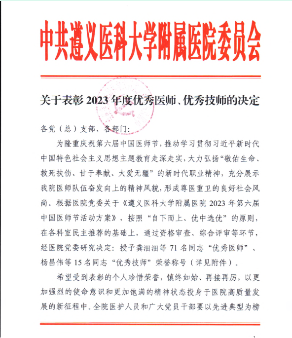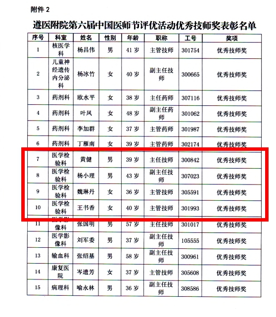 热烈祝贺太阳成tyc122cc集团附属医院医学检验科黄健教授、杨小理副教授、王书香、魏琳丹老师荣获2023年度优秀技师荣誉!