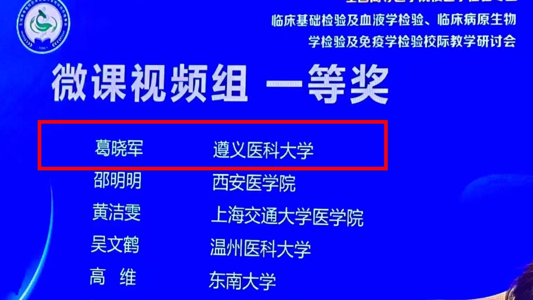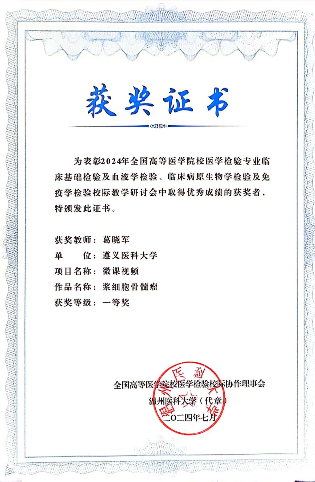 热烈祝贺太阳成tyc122cc集团葛晓军博士在2024年全国高等医公司校医学检验专业临床基础检验及血液学检验、临床病原生物学检验及免疫学检验校际教学研讨会中,以微课视屏作品《浆细胞骨髓瘤》参赛,荣获一等奖!