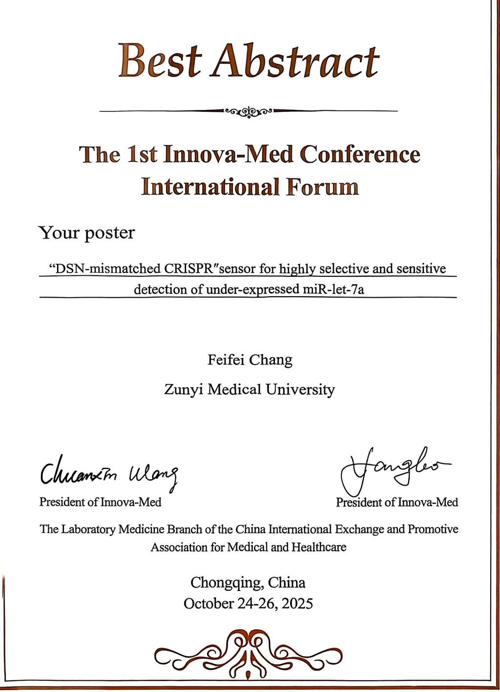10月24日至26日,由Innova-Med协会主办的首届Innova-Med国际会议研究生学术论坛在重庆隆重举行。本次论坛作为医学检验技术与分子诊断领域的一项重要国际学术活动,致力于为全球研究生构建高层次的交流平台,聚焦行业前沿动态与发展趋势展开深入探讨。