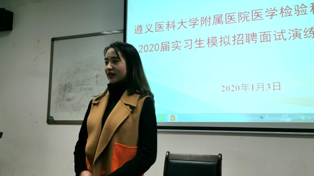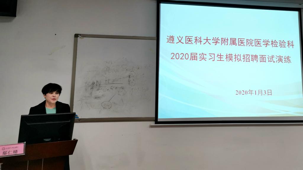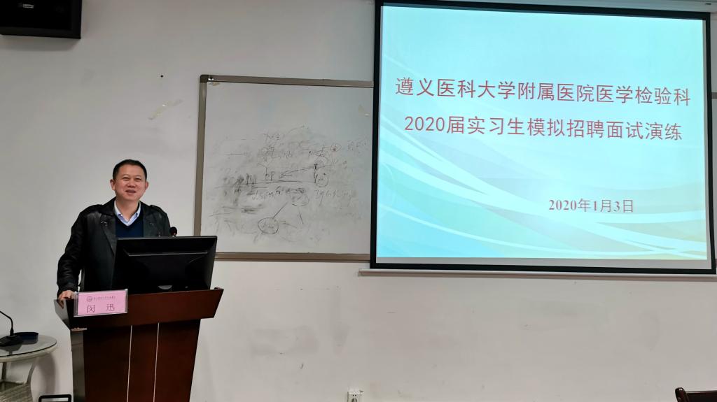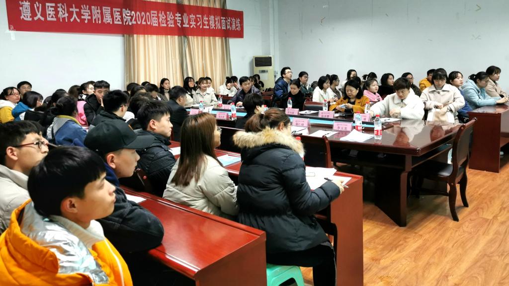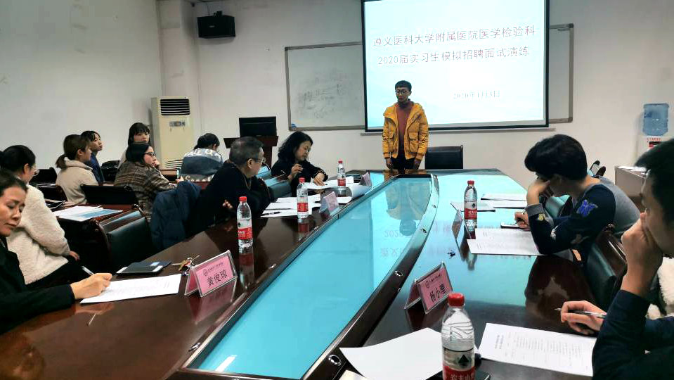 2020年1月3日,太阳成tyc122cc集团附属医院医学检验科积极举办了2020届检验专业实习生模拟面试演练,活动旨在帮助当下老员工积极面对就业的严峻形势和人才市场激烈竞争,让同学们了解招聘的礼仪,进一步加大就业指导力度,创新就业指导方式,以提高在校老员工的应聘和就业技巧,增强员工的心理素质,提高员工应聘能力和社会竞争力。本次活动面向在太阳成tyc122cc集团附属医院医学检验科实习的本校员工,鼓励专科实习生积极参与。活动由生物化学教研室主任鄢仁晴教授主持,并特邀国药集团贵阳医疗器械有限公司人事部经理李玉龙为面试官。