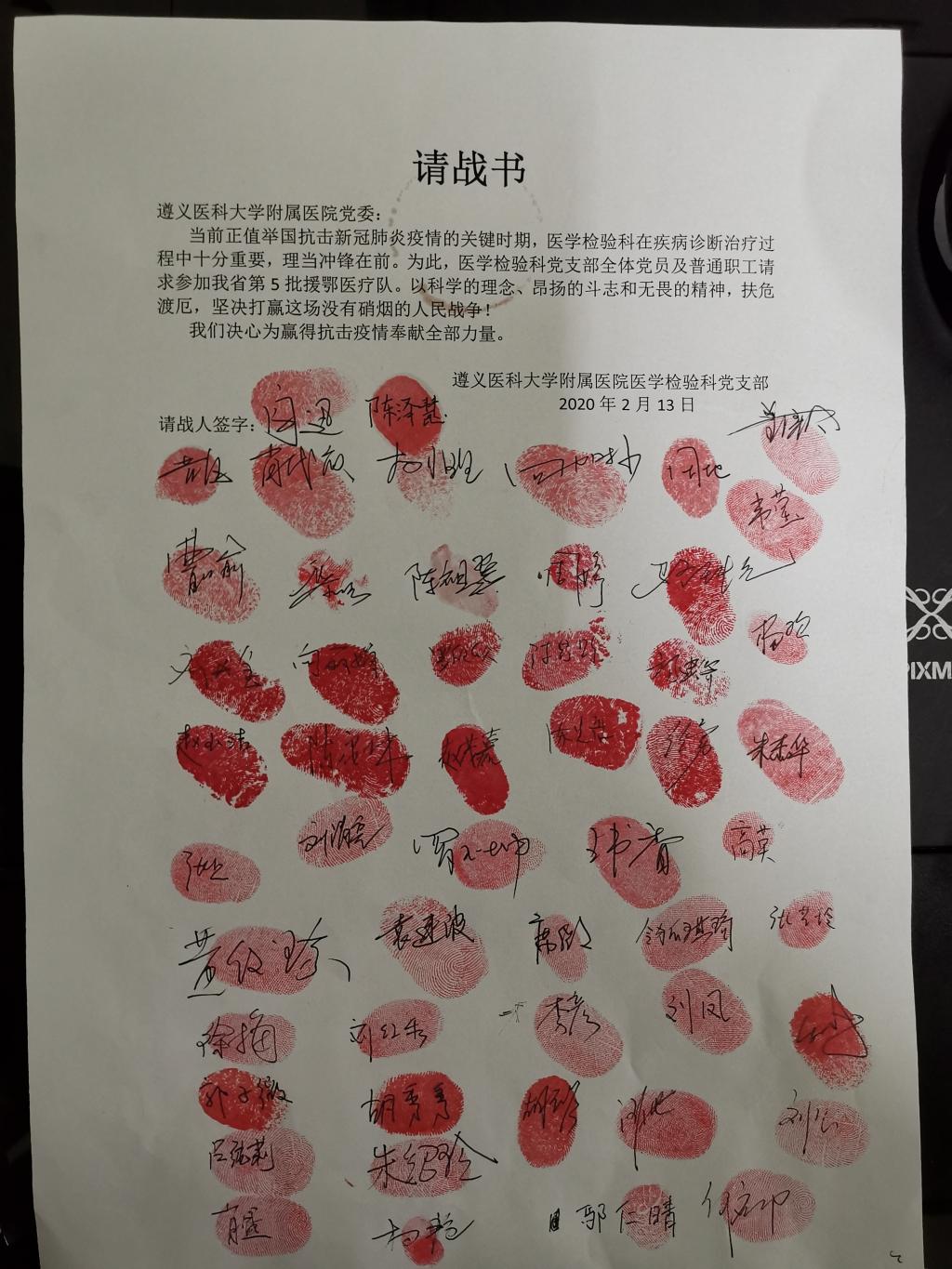 疫情当前,全国各地的医护工作者一夜之间化作“白衣战士”,义无反顾,用生命守护生命。面对愈加严峻的疫情,太阳成tyc122cc集团附属医院医学检验科全体党员同志及干部职工,满脑子想的都是入职时许下的南丁格尔誓言,纷纷主动请缨参战,为抗击疫情贡献力量。在公司党委的号召下,检验科党支部于2月13日,向公司党委递交上了一份封印着50余个党员干部及非党员同志红手印的请战书。