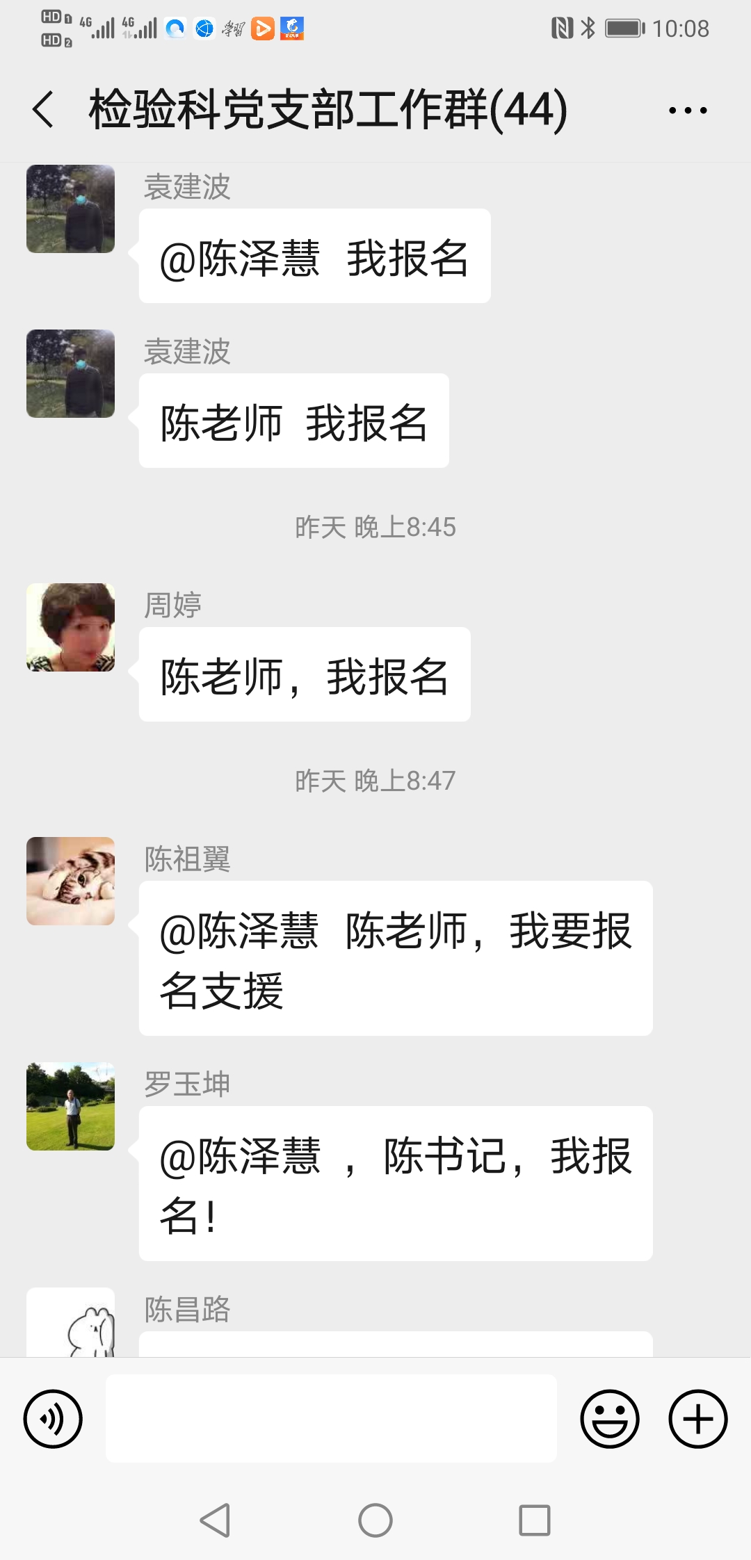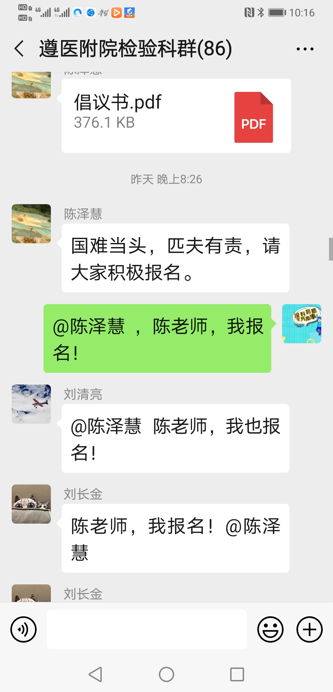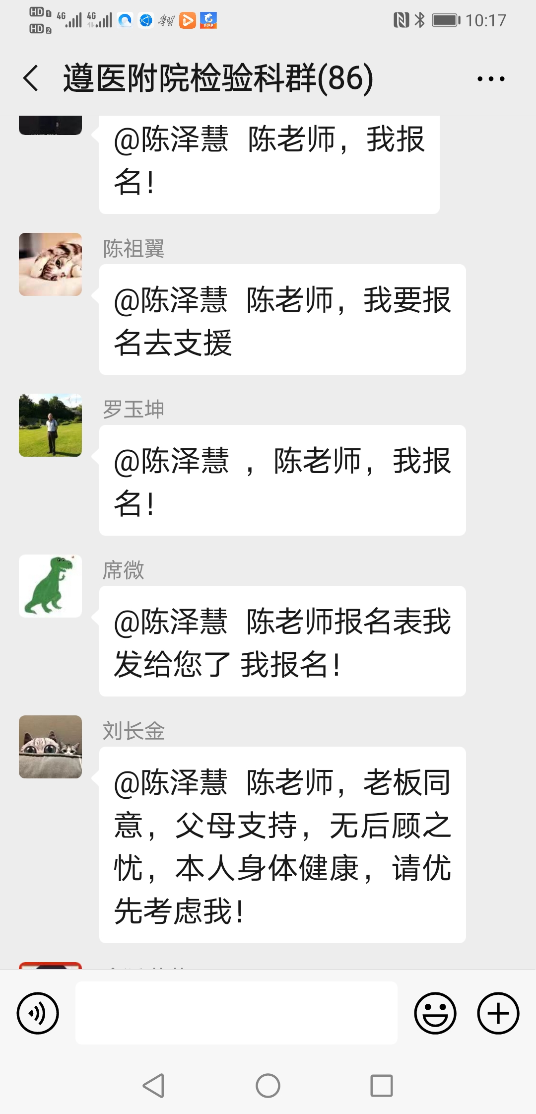 ……@陈泽慧 陈老师 我家还有兄弟姐妹照顾,我现在也没成家,也没娃娃,也没有后顾之忧,也是男生,且身强力壮,轮转过发光、生化和整个临检,况且临床大部分内科我都轮转学习过;也是新党员,国家有难,匹夫有责,希望领导们考虑我去吧!