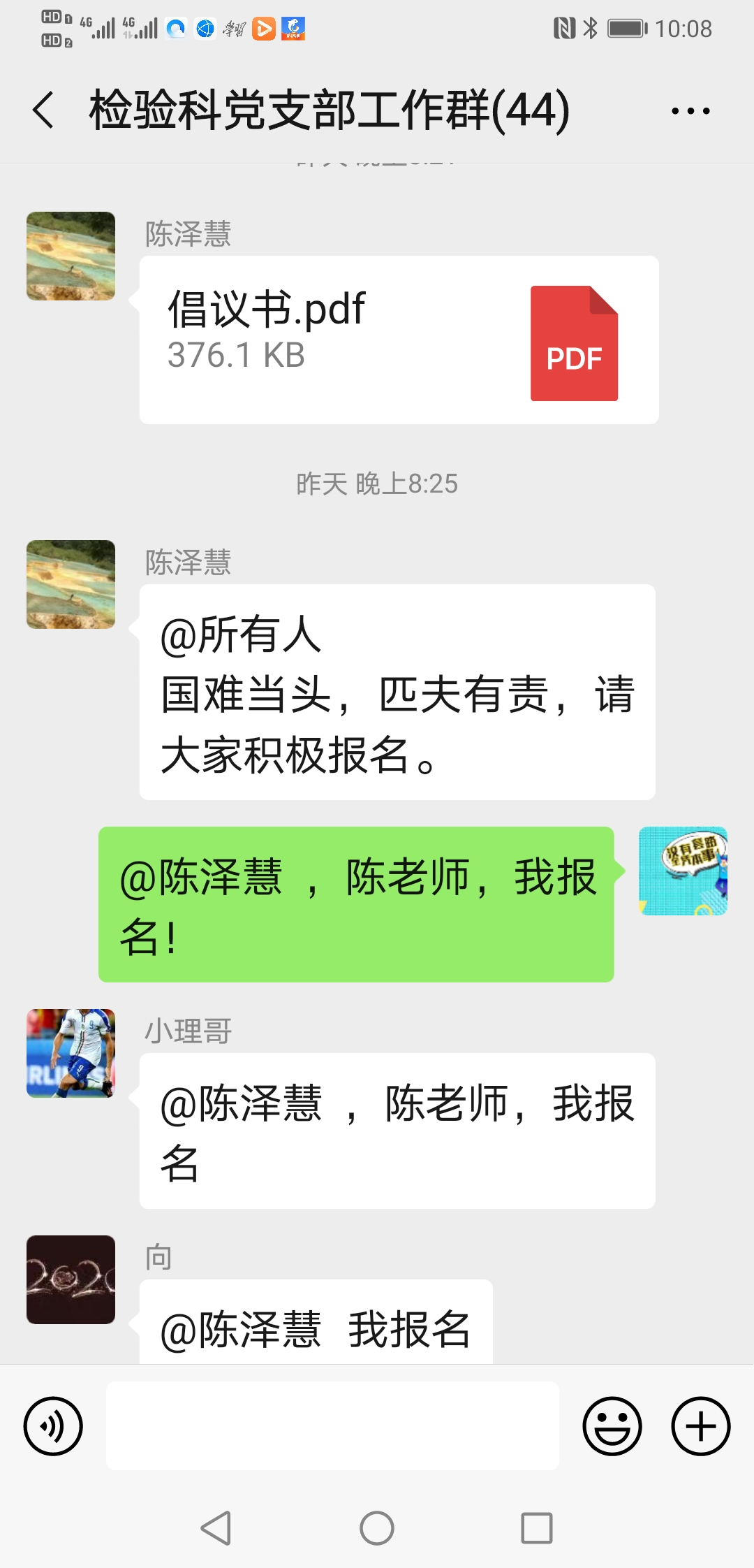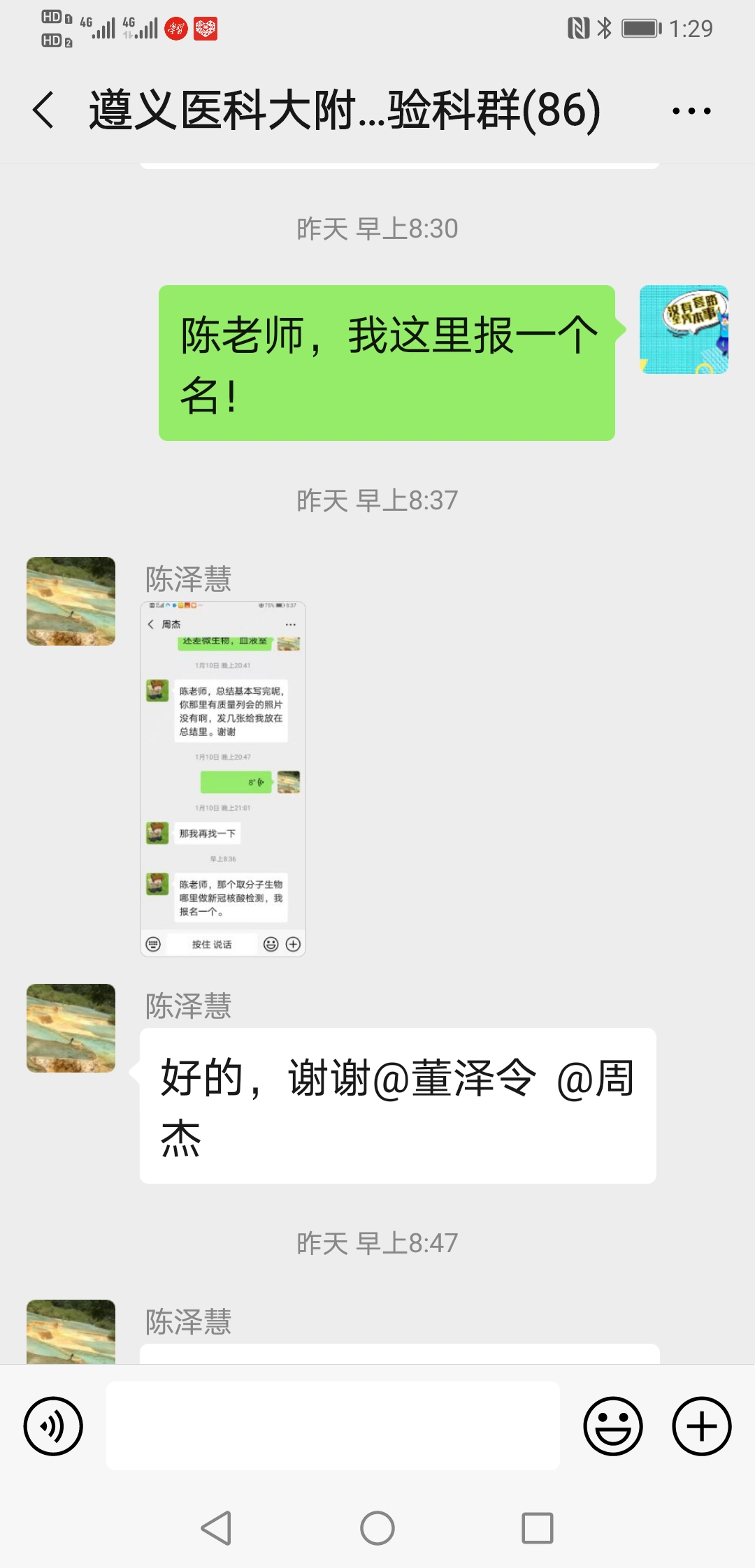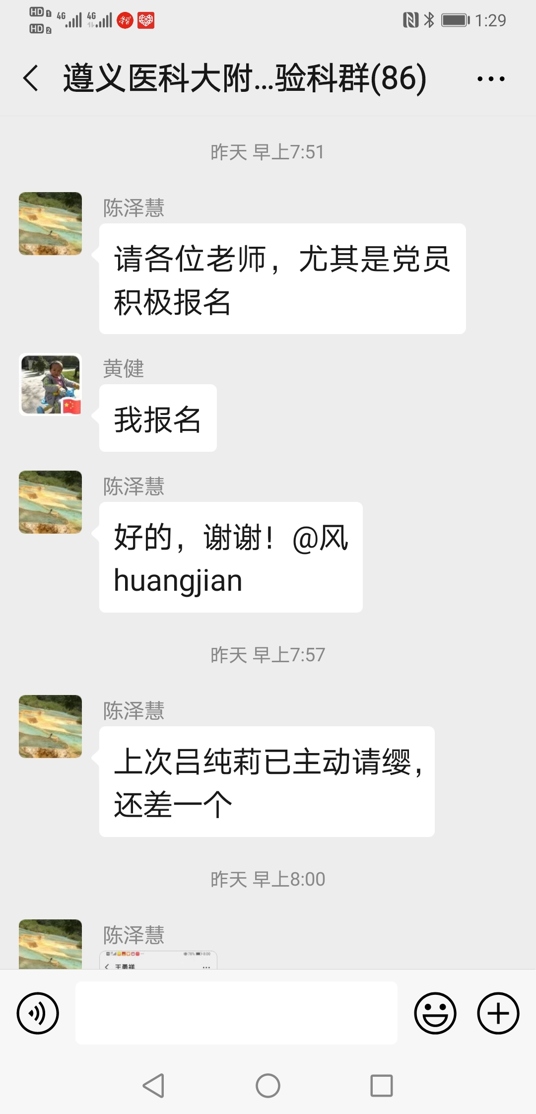 ……@陈泽慧 陈老师 我家还有兄弟姐妹照顾,我现在也没成家,也没娃娃,也没有后顾之忧,也是男生,且身强力壮,轮转过发光、生化和整个临检,况且临床大部分内科我都轮转学习过;也是新党员,国家有难,匹夫有责,希望领导们考虑我去吧!
