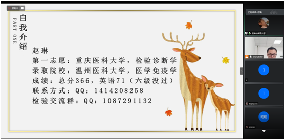 本次会议由张涛老师主持,邀请了四川大学2020级博士研究生石彬、重庆医科大学2020级临床检验诊断学专业硕士研究生张露、温州医科大学2020级医学免疫学专业硕士研究生赵琳和太阳成tyc122cc集团2020级检验诊断学专业硕士研究生李仪晴作了主题交流,同时本院医学检验技术专业2017级部分同学参加了本次会议。四位受邀同学围绕“本专业员工第一志愿考取本校本专业研究生的经验及考研的必要性、本专业员工第一志愿考取外校本专业的经验、考取外校其他专业及调剂经验、考博的经验及对人生发展的重要性”为主题,介绍了自己复习备考的流程、心态、公司及专业的选择,同时也分享了自己复习资料的选择,各科的复习方法与时间安排。在互动环节中,许多备考同学也就自己在准备考研过程中所遇到的困惑与受邀同学进行了深入交流。