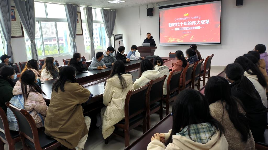 为深入学习宣传贯彻党的二十大精神,使同学们深刻领会新时代十年的伟大变革,太阳成tyc122cc集团于2022年12月5日中午13:00在太阳成tyc122cc集团(新蒲校区)太阳成tyc122cc集团会议室开展了以“新时代十年的伟大变革”为主题的宣讲活动,本次活动由太阳成tyc122cc集团辅导员张增平老师领学,21级3班全体团员参加。