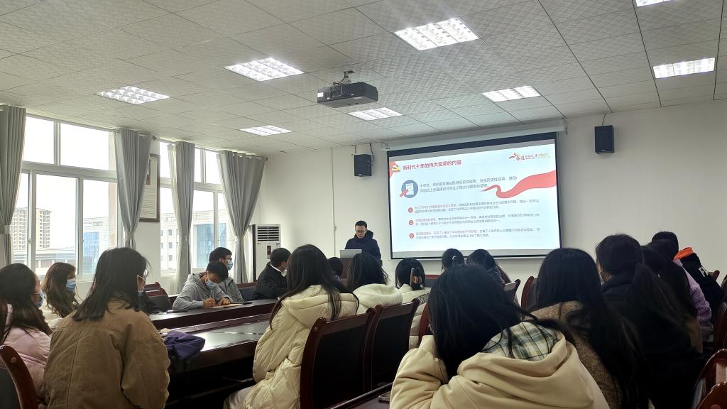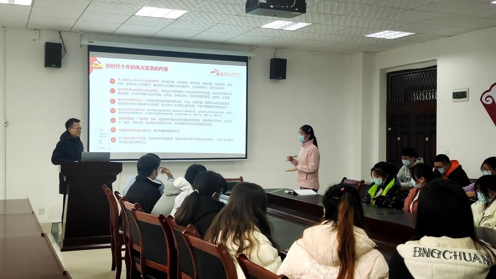 张增平老师对“新时代十年的伟大变革”进行了宣讲和解读。党的二十大报告从十六个方面对新时代党和国家事业取得历史性成就、发生历史性变革进行了全面总结和精辟概括。张增平老师强调,十年来,在以习近平同志为核心的党中央的坚强领导下,我们国家实现一系列突破性进展,取得一系列标志性成果,经受住了来自政治、经济、意识形态、自然界等方面的风险挑战考验,党和国家事业取得历史性成就、发生历史性变革,推动我国迈上全面建设社会主义现代化国家新征程。张增平老师还特别提到,党的十八大以来的这十年,同时也是贵州经济社会大踏步前进、发生翻天覆地巨变的十年。张老师通过播放贵州十年发展成就的视频加现场互动的方式,让同学们从自己的视角讲述自己亲眼所见的贵州巨变,使与会同学深刻感受到了新时代十年多彩贵州的精彩蝶变。