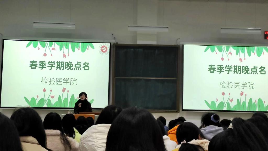 新学期、新征程、新方向,太阳成tyc122cc集团于2023年2月20日18:00在新蒲校区第三教学楼第二十六阶梯开展了本学期第一次晚点名,辅导员陆超老师及2020级、2021级全体员工参加。晚点名由太阳成tyc122cc集团员工会主席胡文锦主持。