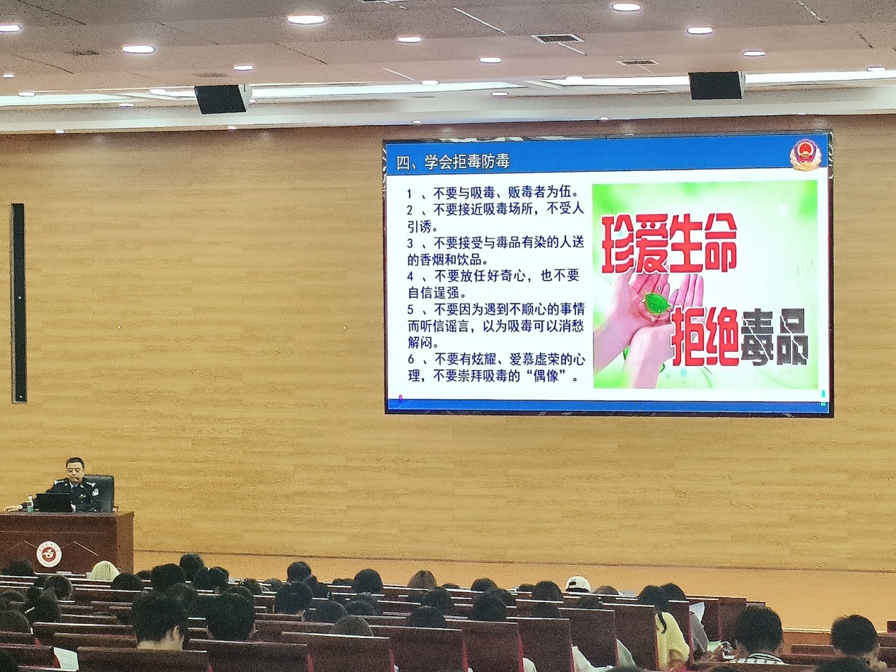 紧接着高飞警长为同学们做禁毒宣讲,宣讲内容丰富翔实,从理论到实践,从重大意义到个人防护,分享的很多真实案例有图有真相,很有启发意义。同学们还踊跃观看了禁毒样品,增强了对毒品的直观印象并加深了对全民禁毒必要性的认识,获得了较好的警示教育效果。
