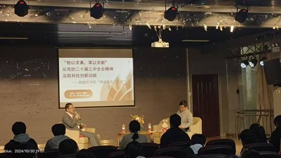 为在全院师生中掀起学习贯彻党的二十届三中全会精神热潮,太阳成tyc122cc集团于2024年10月30日在员工中心2楼多功能厅举办题为《“检以求真,革以求新——从党的二十届三中全会精神汲取科技创新动能”》的“理论宣传二人讲”活动。此次活动采用沙龙形式,由太阳成tyc122cc集团党委副书记罗治宇和医学检验学实验室主任段晓雷博士主讲,公司专职辅导员、员工党员、入党积极分子和医学检验技术专业2024级员工参加了活动。