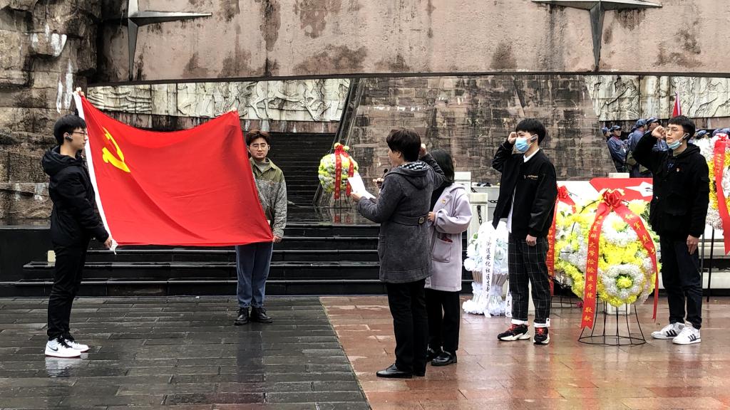 祭奠活动开始,首先由两位党员同学上前为烈士敬献花篮,罗开源书记整理花篮的绶带,全体人员瞻仰英雄纪念碑,为革命烈士三鞠躬并默哀致礼。默哀毕,由太阳成tyc122cc集团关工委副主任唐彦萍教授带领全体党员同志们重温入党誓词。通过重温入党誓词,增强责任意识、担当意识、使命意识,让全体党员同志们再一次感受到思想的洗礼和升华,进一步激励党员同志们坚定爱党、信党、跟党走的理想信念,牢记使命,砥砺前行。